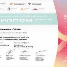 Студенческий театр миниатюр «Гвоздь» завоевал сразу две награды – первое место за постановку «Вспомни обо мне» и специальный приз за пантомиму «Незадачливый грабитель». «В этом году на фестивале было рекордное количество участников и конкурсных номеров. И задача победить была не из простых. Театр миниатюр «Гвоздь» показывал два номера в двух конкурсных направлениях. В направлении «Театр» мы сделали пластический спектакль «Вспомни обо мне», посвященный теме Великой Отечественной войны. В направлении «Оригинальный жанр» – веселую пантомиму «Незадачливый грабитель». В направлении «Театр» у нас возникли дополнительные сложности: нас поместили в профильную группу, на том основании, что участники спектакля учатся на режиссерском отделении. А к профильной группе у жюри всегда особые требования. Но несмотря на все сложности и конкурс в группе профессионалов, театр миниатюр «Гвоздь» стал лауреатом I степени. В направлении «Оригинальный жанр» театр тоже выступил удачно. Актеры театра Олег Раздобреев и Мария Зубарева получили специальный приз «За высокий уровень владения пластикой тела», – прокомментировал заслуженный деятель культуры Югры – художественный руководитель и режиссер театра Виктор Проскуряков.