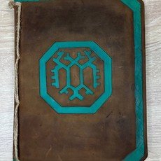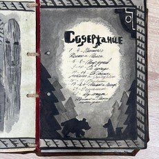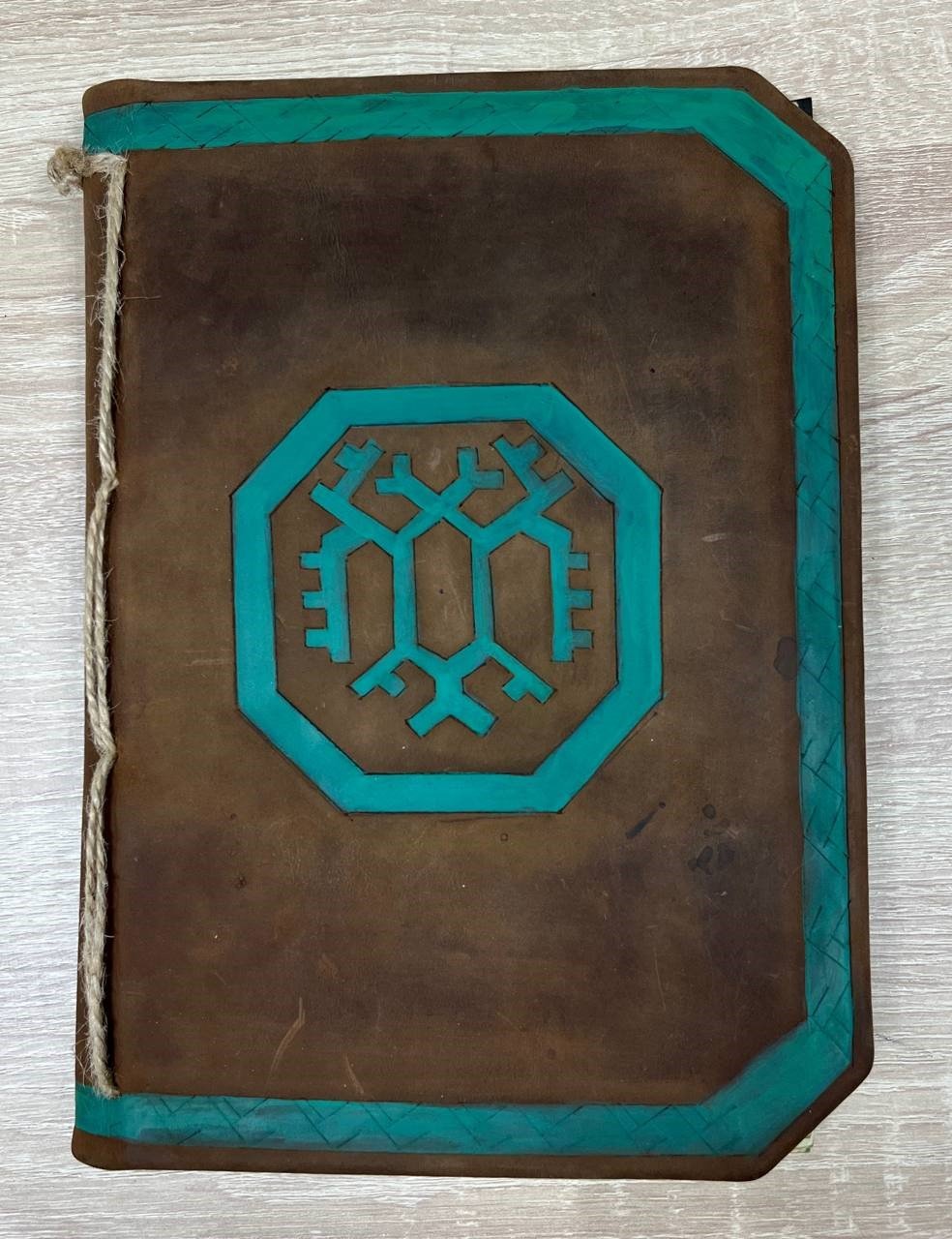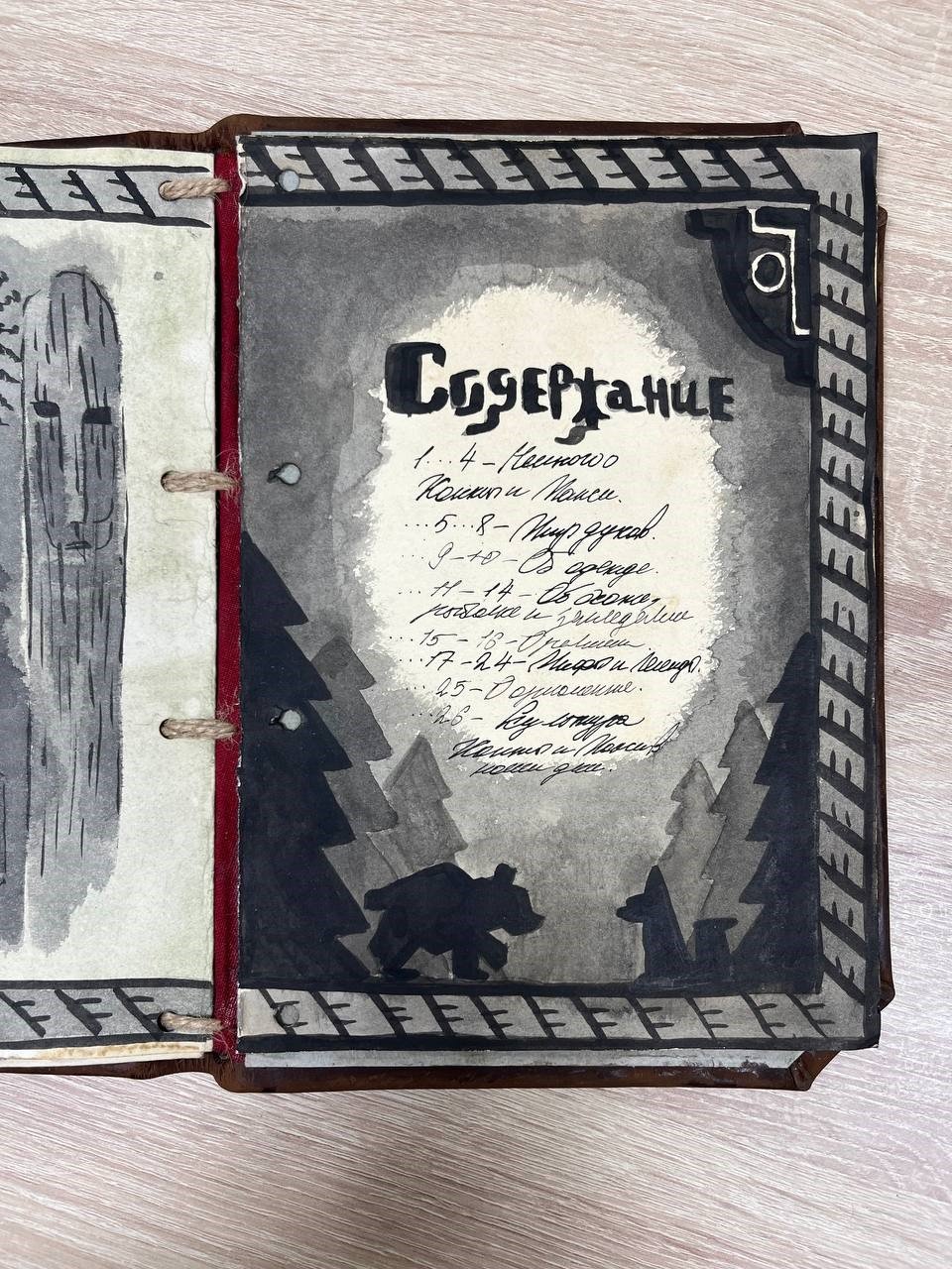 Николай рассказал, что у него был небольшой опыт в переплетном ремесле, и он решил выполнить задание именно в таком формате, сделав обложку из переплетного картона и натуральной коровьей кожи, окрашенной в зеленый цвет. Узоры на книге сначала планировал выполнить обжигом, но в итоге выбрал более тонкий и аккуратный способ – продавливание шилом. При обработке кожи он использовал стамеску, чтобы края на клапанах были тоньше и аккуратнее. Студент взял ватман и состарил его с помощью чая и кофе, придав листам вид настоящих старинных страниц. Текст и рисунки он сначала набросал карандашом, а затем аккуратно выполнил тушью с помощью пера и кисти. Работа с пером оказалась сложной: его нужно было постоянно промывать, а большой объем текста требовал терпения и усидчивости. Все страницы он сшил вручную бечевкой, что добавило книге особую атмосферу.