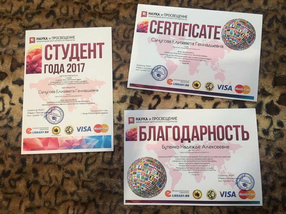 Хочется поделиться с вами радостью, которую испытала совсем недавно. Руководством МЦНС «Наука и просвещение» я была приглашена на международный научно-практический конкурс, проводимый 23 июня в г. Пензе. Поразили замечательная организация мероприятия, теплый прием, положительная оценка и высокие стандарты, предъявляемые к научным исследованиям. Я получила диплом победителя I степени и сертификат в секции «Филологические науки» Международного научно-практического конкурса «Студент года — 2017: Лучшая научная работа» — за работу на тему «Свобода и необходимость в учении Н. А. Бердяева», которую выполняла под руководством кандидата философских наук, доцента кафедры философии и права СурГУ Надежды Алексеевны Бутенко, за что ей огромное спасибо!