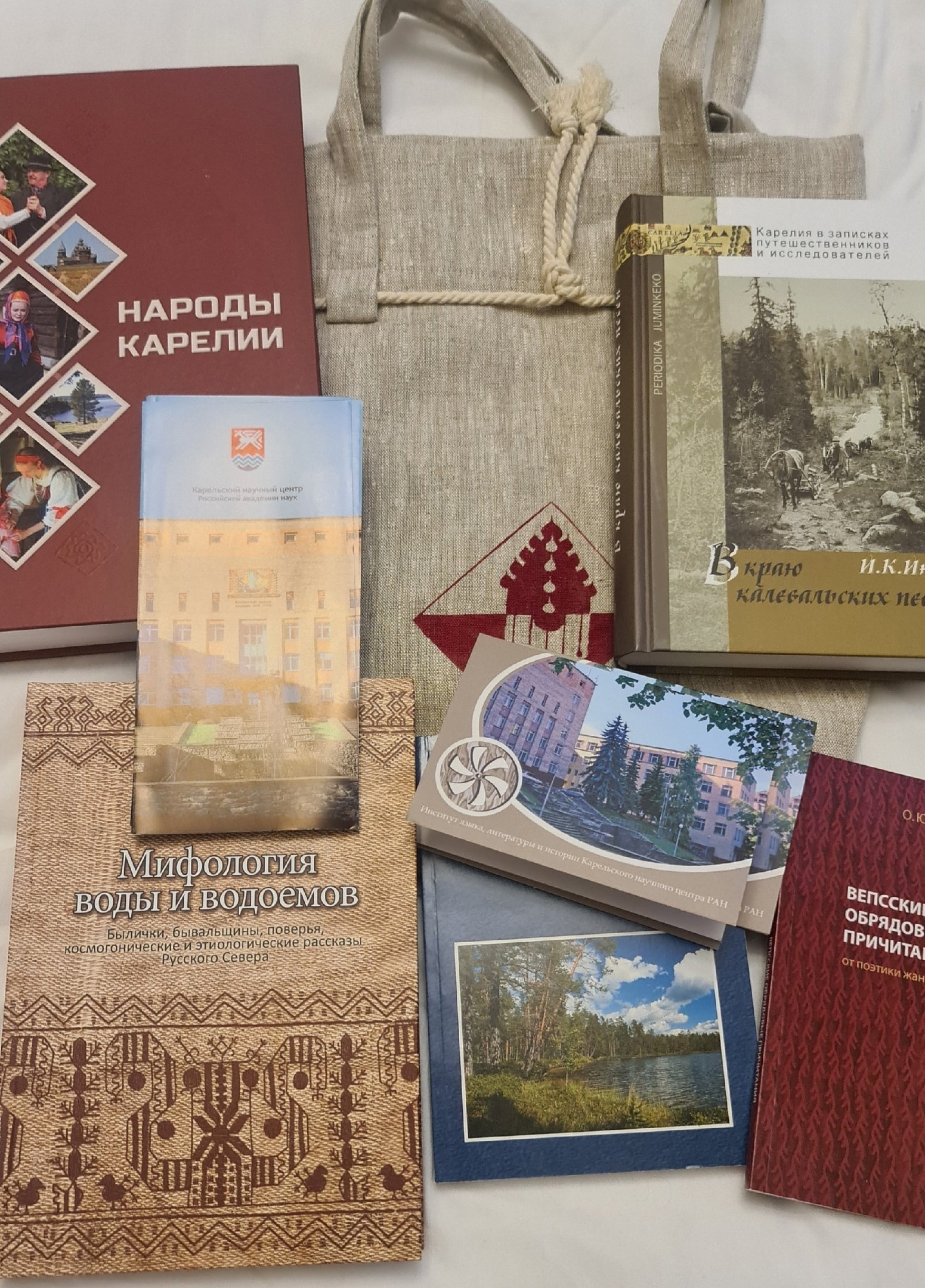 Наталья Анатольевна Синицкая, генеральный директор издательства «Периодика», член Общественной палаты Республики Карелия, член карельского отделения Союза писателей России, вручила в дар ИПО КНЮ рассказы и стихи. Наталья Анатольевна работает главным редактором газеты «Oma mua» («Родная земля»), входит в термино-орфографическую комиссию при Главе Карелии, пишет произведения на ливвиковском наречии карельского языка. Множество книг по языковым исследованиям и коренным народам преподнесли нашему Институту также сотрудники научного центра РАН.