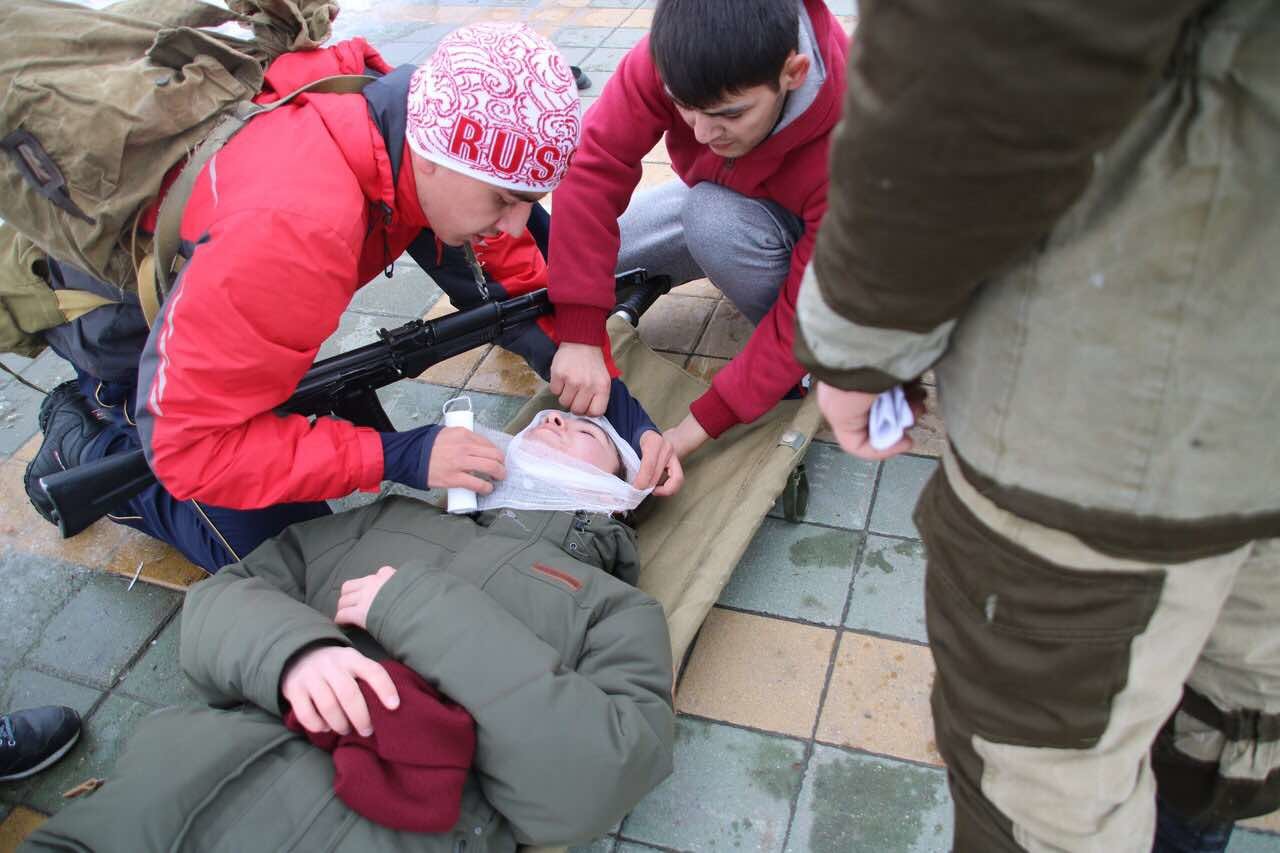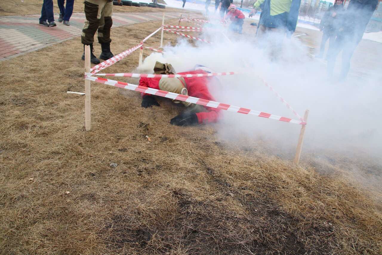 Далее участники оказывали первую медицинскую помощь раненому и несли его на носилках до следующего тура - стрельбы. В этом испытании нужно было постараться. Не попал - стреляй снова. Попал - бежишь на следующий этап, где спускаешься по канату при поддержке товарищей. Как здесь важна была работа в команде, сплоченность и полное доверие! Далее - минное поле, через которое нужно как можно быстрее пройти, не задев "мины" - шины.
