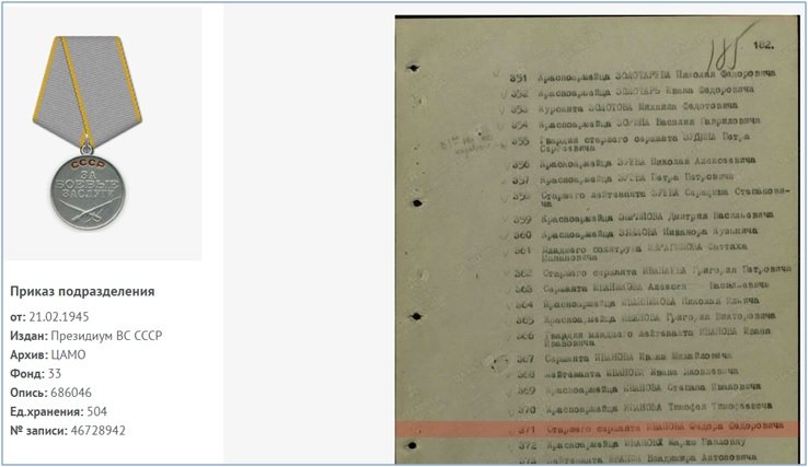 «К сожалению, у нас нет свидетельств, переписки с фронта, поэтому невозможно точно проследить судьбу солдата-сержанта Иванова Фёдора Фёдоровича вплоть до ноября 1942 года. А потому начнем с официальных документов о награждении его боевой наградой, медалью «За боевые заслуги», которой он был отмечен в самый первый день начала печально известной Ржевско-Сычёвской операции «Марс» (25.11. – 20.12.1942 г.) Западного фронта (командующий генерал-полковник И.С. Конев). Эта операция является второй попыткой отодвинуть немцев от Москвы, окружить 9-ю армию Моделя, ликвидировать Ржевский выступ. Отцу уже 34 года. Он командир саперного отделения в 141-м саперном батальоне 33-й отдельной саперной бригады в 20-й армии. Награждён за умелые и своевременные действия подразделения в бою, который начался в 9:20 утра 25 ноября, где и был легко ранен у села Жеребцово, что недалеко от старинного села Хлепень, но поле боя не покинул», – с особой грустью и в то же время с гордостью продолжает рассказ об отце ученый Сургутского госуниверситета.