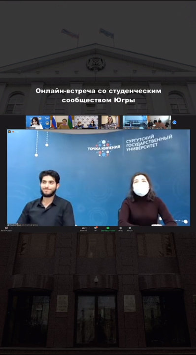Модераторами встречи выступили председатель студенческого совета Сургутского госуниверситета Ася Кочарян, студентка 4-го курса Института государства и права, обладатель памятной медали Президента РФ «За бескорыстный в клад в организацию Общероссийской акции взаимопомощи #МыВместе», и выпускница СурГУ, а ныне начальник отдела по развитию добровольческой деятельности Молодежного центра (г. Нижневартовск) Кристина Яворская.