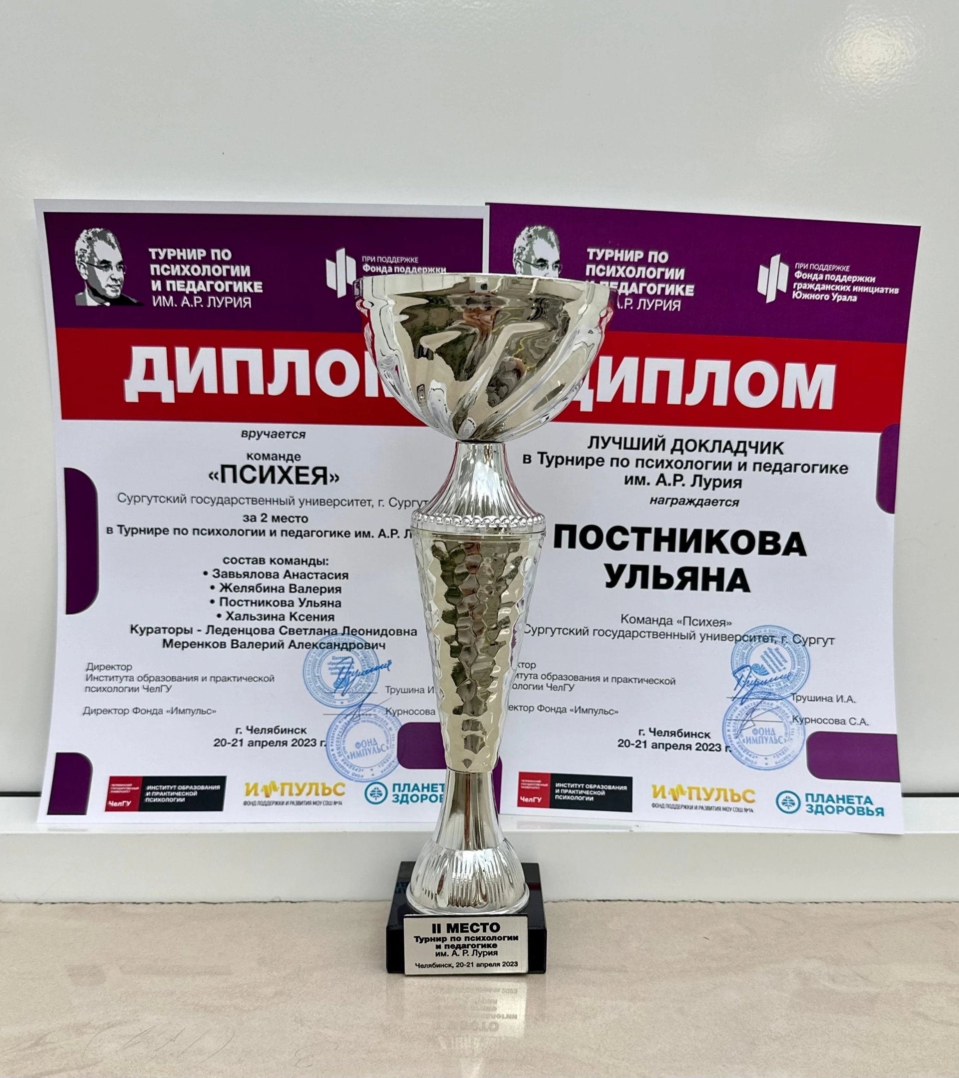 Студенты 5-го курса направления «Клиническая психология» заняли II место на Турнире по психологии и педагогике им. А. Р. Лурия в г. Челябинске. В двух этапах турнира участвовали 35 команд из более чем 10 городов России. Член команды СурГУ Ульяна Юрьевна Постникова стала одной из двух участниц турнира, получивших диплом «Лучший докладчик».