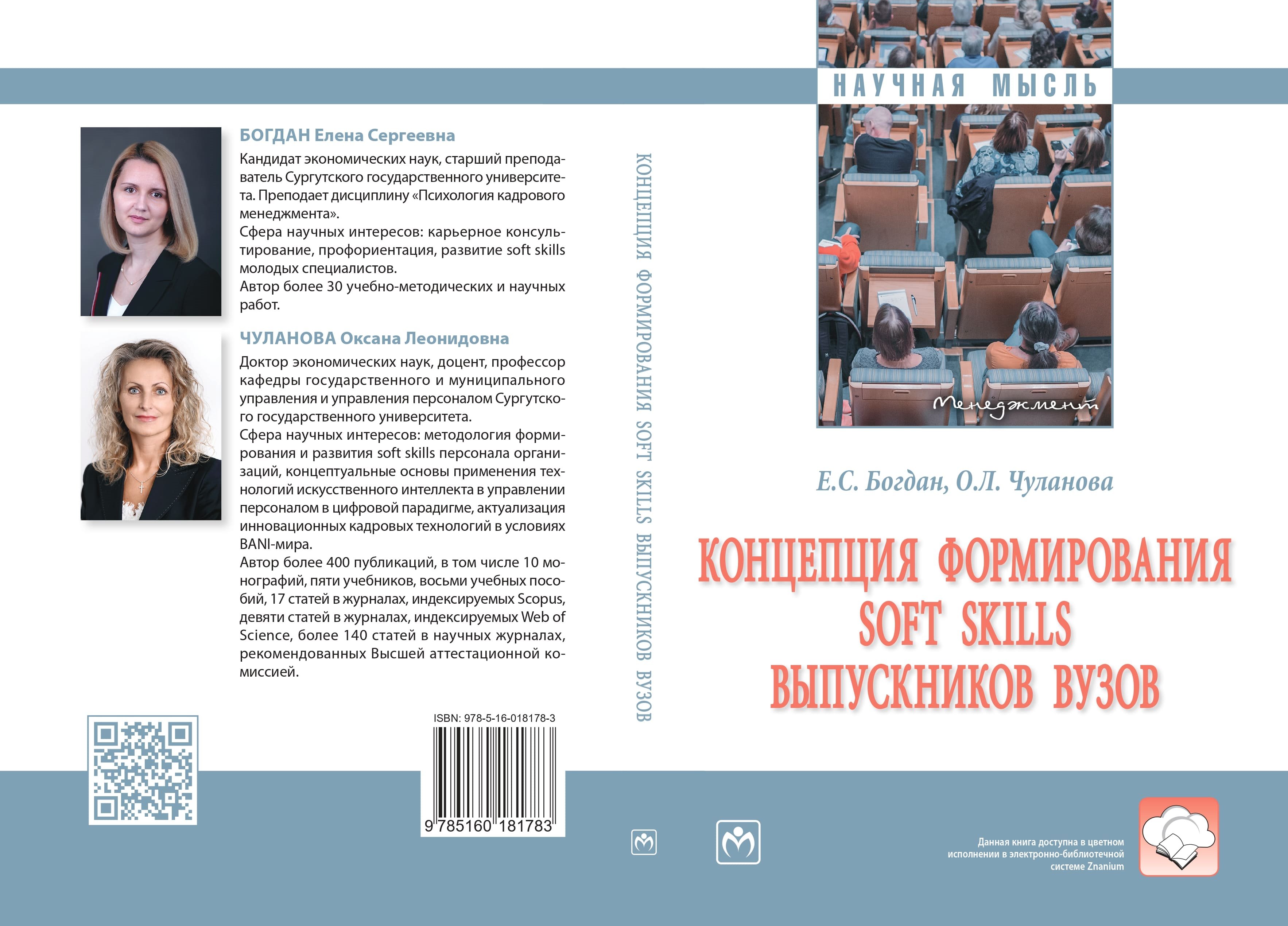 Монография доктора экономических наук, профессора Института экономики и управления Cургутского госуниверситета Оксаны Чулановой и кандидата экономических наук, старшего преподавателя Елены Богдан – «Концепция формирования soft skills выпускников вузов» удостоена диплома второй степени в номинации «Лучшая монография по управлению персоналом» Всероссийского конкурса «Лучший научный труд по управлению персоналом».