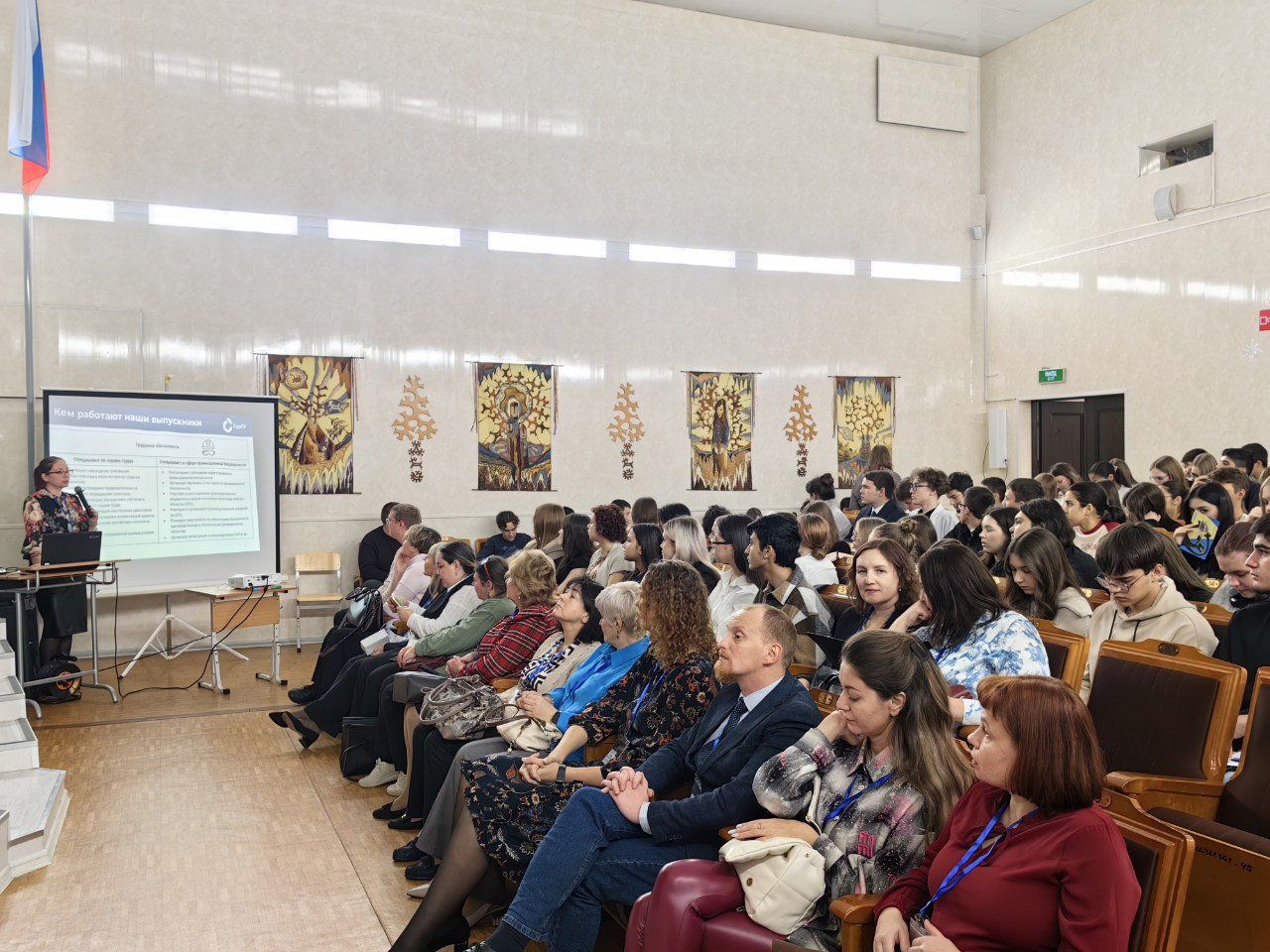 В рамках конференции была также проведена XI городская научно-инженерная выставка. Департаментом образования города Лангепаса и администрацией ЛГ МАОУ «СОШ № 5» была организована профориентационная встреча педагогов с обучающимися 10–11-х классов всех школ Лангепаса (более 120 человек). Дарья Васильевна познакомила учащихся с направлениями подготовки, реализуемыми Институтом естественных и технических наук СурГУ.