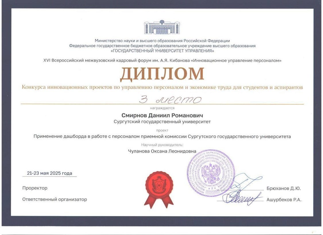 Особенно отличились делегаты СурГУ в Конкурсе инновационных проектов по управлению персоналом и экономике труда для студентов и аспирантов. Даниил Смирнов занял третье место с проектом «Применение дашборда в работе с персоналом приемной комиссии Сургутского государственного университета». Его работа предлагает использование цифровых инструментов кадровой аналитики для повышения эффективности управления персоналом приемной комиссии СурГУ. Анжела Гатауллина удостоилась приза в номинации Homo excitari за проект «Разработка инструментов мотивации проектных команд». Ее исследование направлено на создание эффективных механизмов стимулирования командной работы. Научным руководителем обоих успешных студенческих проектов выступила Оксана Чуланова, доктор экономических наук, профессор кафедры государственного и муниципального управления и управления персоналом СурГУ.