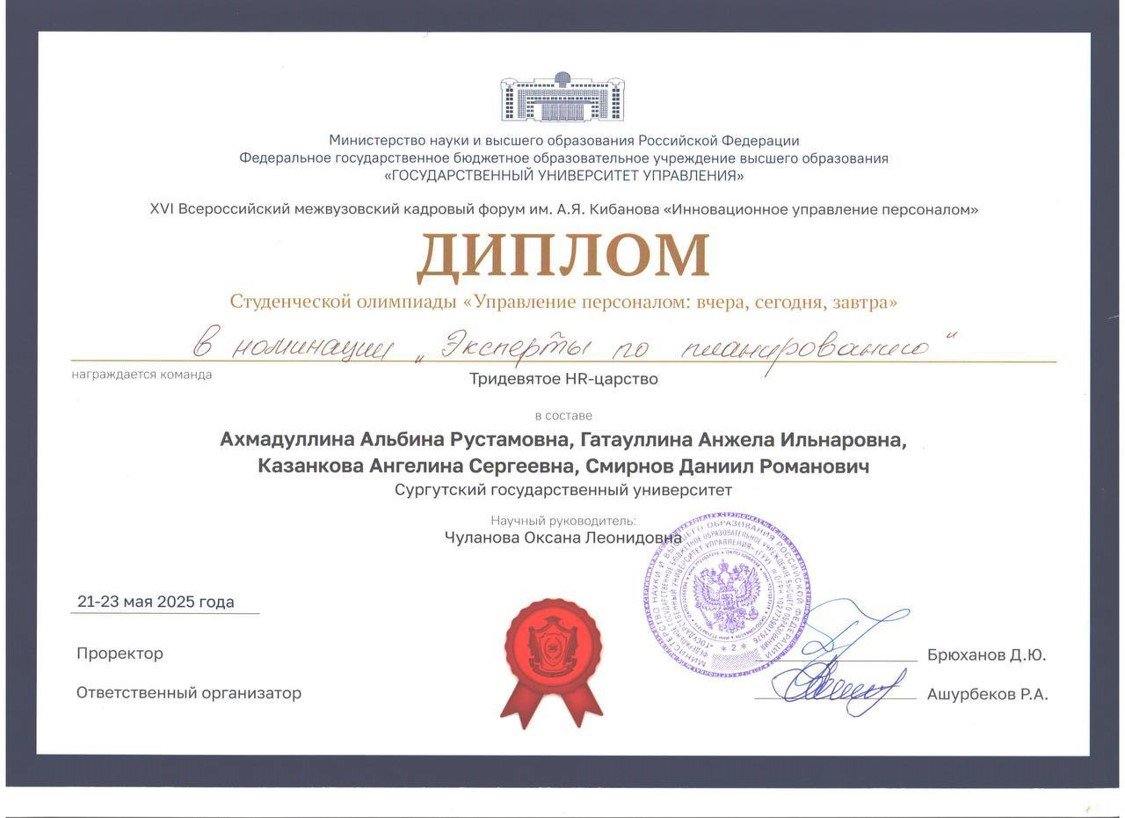 Обучающиеся Института экономики и управления Сургутского государственного университета добились значительных успехов на XVI Всероссийском межвузовском кадровом форуме имени А. Я. Кибанова «Инновационное управление персоналом». Мероприятие проходило в Москве на базе Государственного университета управления с 21 по 23 мая.
