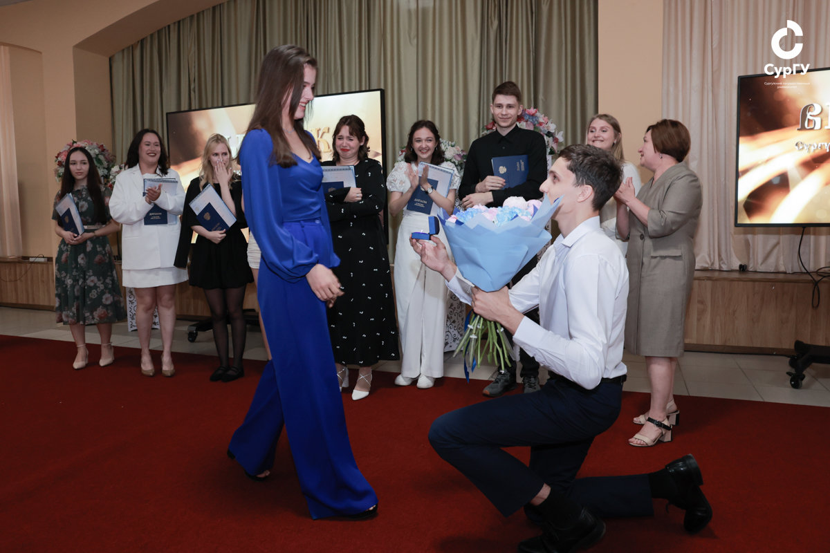 Одним из ярких моментов праздника стало трогательное предложение руки и сердца от выпускника направления «экономика» Александра Парамузова своей возлюбленной – Ангелине Казанковой, выпускнице направления «управление персоналом». Чувственное признание в любви вызвало бурю эмоций у зала.